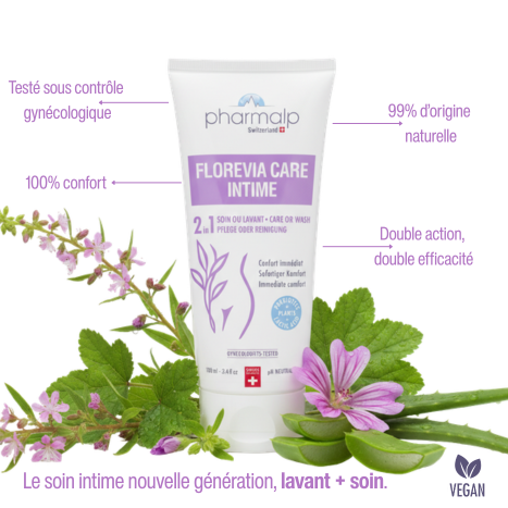 FLOREVIA Care Intime, quant à lui, est destiné au soin de la zone vulvaire externe. En effet, les inconforts ressentis au niveau vaginal peuvent s’accompagner d’une sensibilité accrue de la zone externe, qui peut alors présenter des sensations d’irritation, de sécheresse ou d’inconfort.